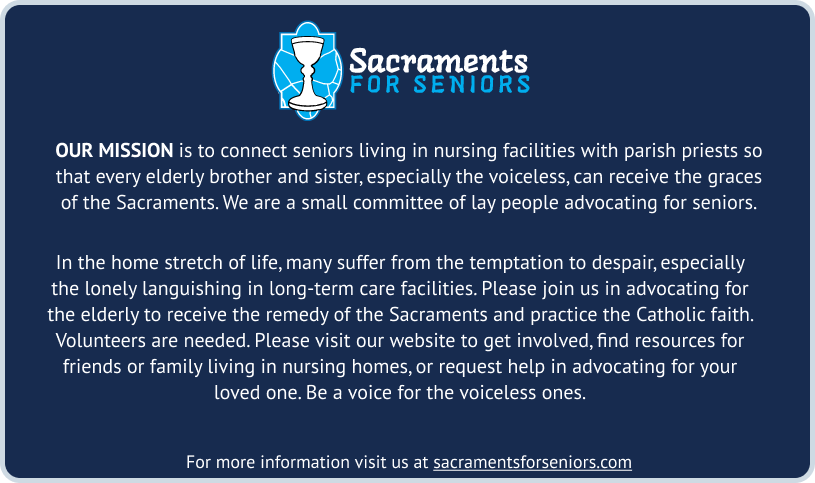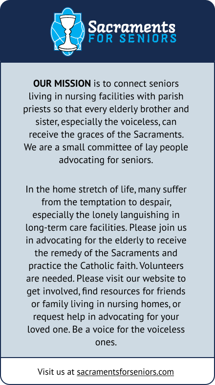 Sacraments for Seniors is a lay-led Catholic initiative dedicated to helping nursing home residents receive the care of the Church.